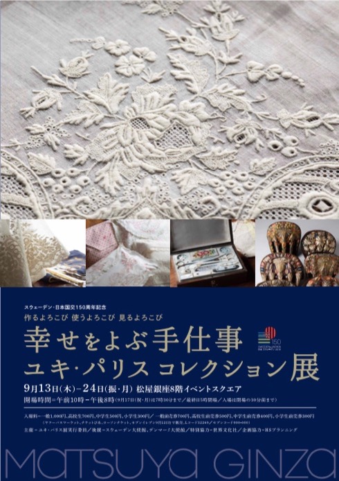 9年ぶりの松屋銀座での展覧会が開催中です。 ユキ・パリスのヨーロッパの糸と針による手仕事作品や道具、資料のコレクションから、コレクターから新たに譲り受けた作品や、多くの未公開の作品を含め、厳選した約500点を展示いたします。 1.作る喜び 2.見る喜び 3.使う喜び 4.スウェーデンの手仕事、の4つのテーマに分けて展示する大変貴重な機会です。 是非足をお運びください。ご来場お待ちしております。